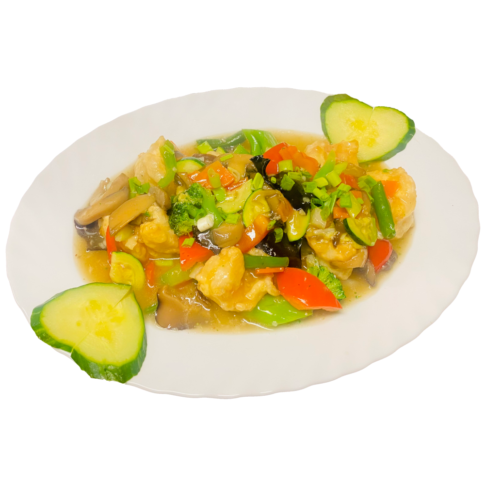 Prawns with broccoli, mushrooms, bok-choy and paprika served in garlic wine sauce