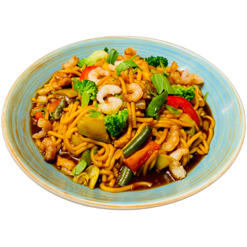 Soft noodles with chicken , shrimps in oyster sauce with garlic, ginger and vegetables.