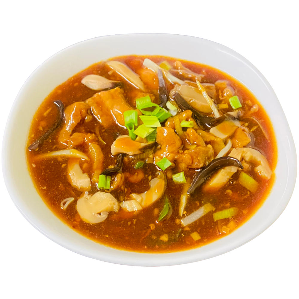 Sliced pork with mushrooms, bamboo and onions