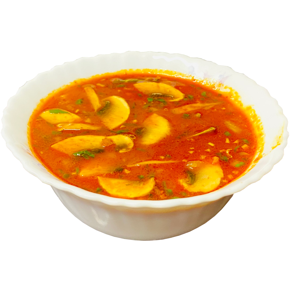Традиционный острый тайский суп с креветками, грибами, листьями кориандра, тайскими травами
